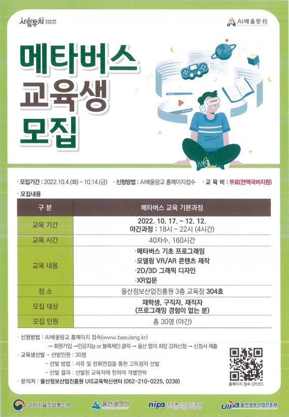 울산광역시에서 과학기술정보통신부「2022년 ICT이노베이션스퀘어 확산사업」일환으로 추진 중인 4차 산업혁명 전문인재 양성 메타버스 교육생을 아래와 같이 모집중에 있사오니, 학생들의 많은 관심과 참여 부탁드립니다.